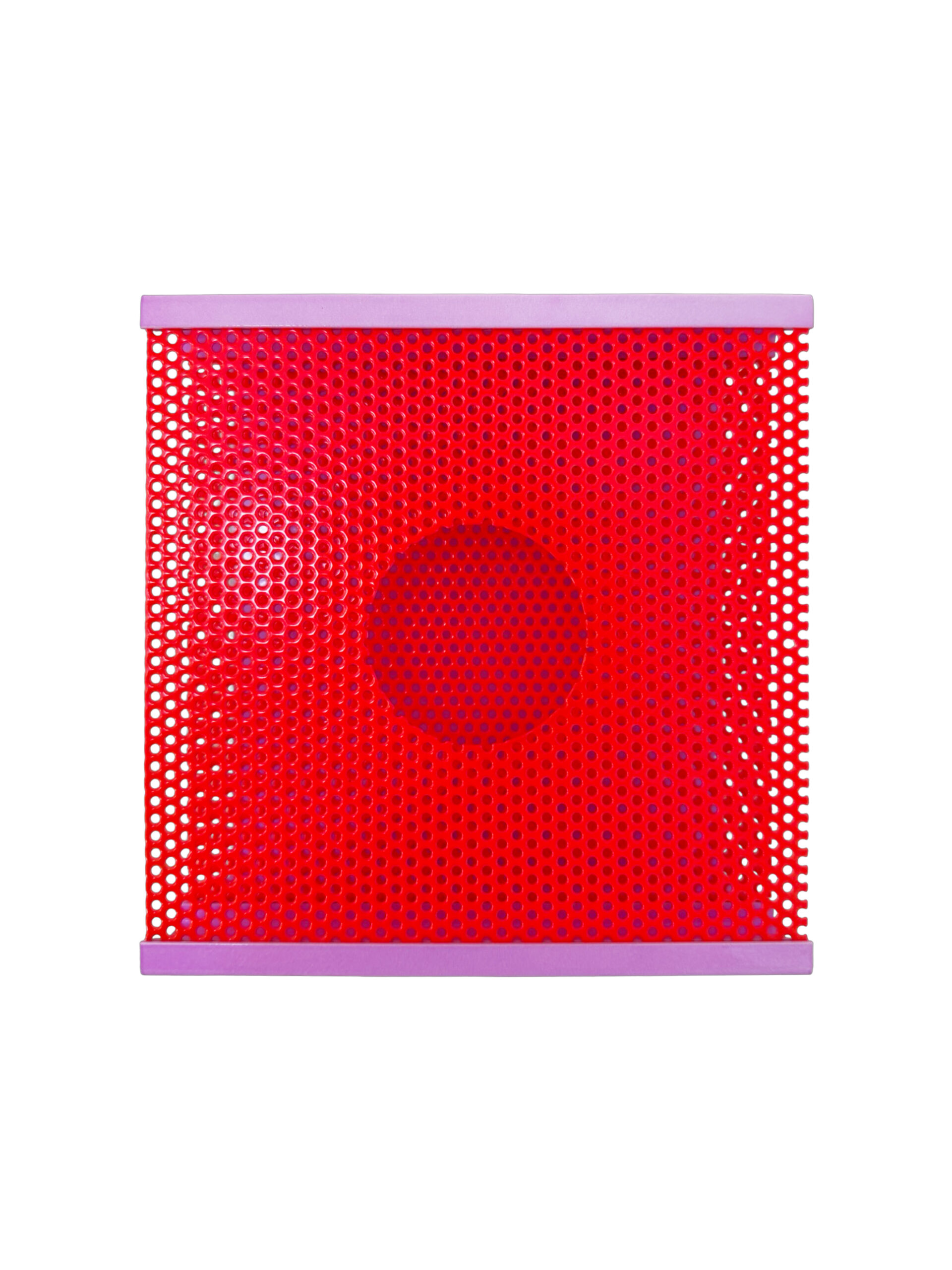 Barber transforms extruded metal into vivid optical instruments. Each piece layers perforated mesh to generate a moiré effect—patterns that shift, vibrate, and fold as viewers move through the space. Powder-coated in hues that echo the brightness of pixels and the ripeness of fruit, the sculptures create a surprising tension between the edible and the digital.