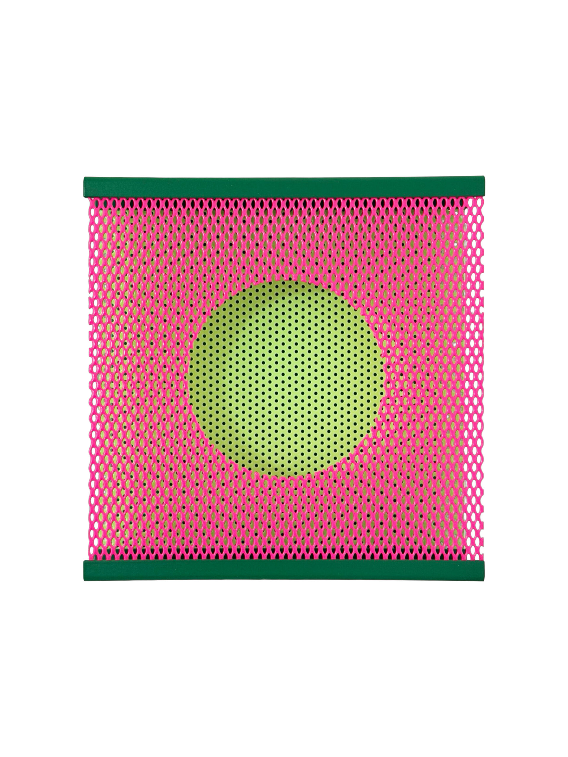 Barber transforms extruded metal into vivid optical instruments. Each piece layers perforated mesh to generate a moiré effect—patterns that shift, vibrate, and fold as viewers move through the space. Powder-coated in hues that echo the brightness of pixels and the ripeness of fruit, the sculptures create a surprising tension between the edible and the digital.