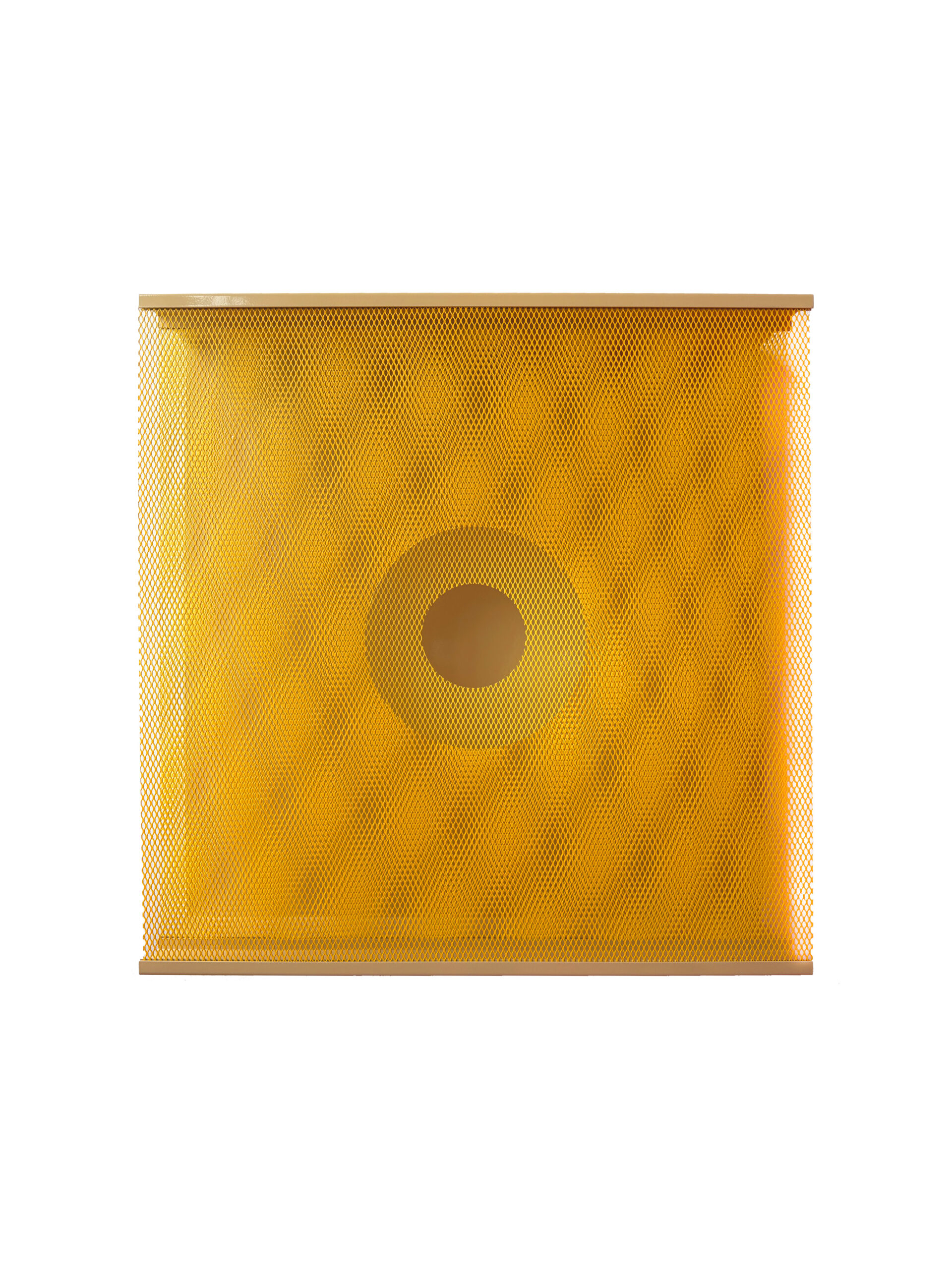 Barber transforms extruded metal into vivid optical instruments. Each piece layers perforated mesh to generate a moiré effect—patterns that shift, vibrate, and fold as viewers move through the space. Powder-coated in hues that echo the brightness of pixels and the ripeness of fruit, the sculptures create a surprising tension between the edible and the digital.